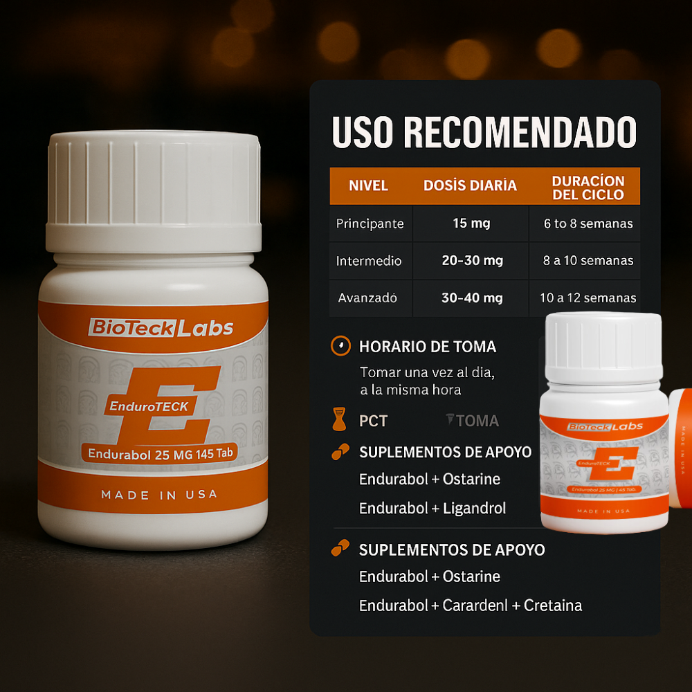 📆 Formas de uso y combinaciones en ciclos y suplementos 🔹 Uso recomendado (por nivel): Nivel Dosis diaria Duración del ciclo Principiante 10-25 mg/día 6-8 semanas Intermedio 25-50 mg/día 8-10 semanas Avanzado 50-75 mg/día 10-12 semanas Se toma una vez al día, preferentemente a la misma hora. 🔹 Combinaciones recomendadas: Objetivo Stack sugerido Volumen limpio Endurabol + Ligandrol (LGD-4033) + Creatina Recomp corporal Endurabol + Ostarine (MK-2866) + BCAAs Definición Endurabol + Cardarine (GW-501516) + Termogénico